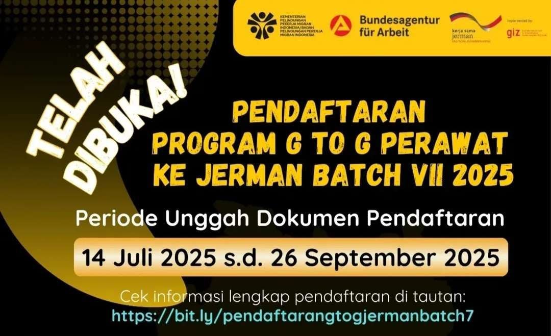 Melansir dari laman resmi bp2mi.go.id, program G to G Perawat ke Jerman adalah program kerja sama antara pemerintah Indonesia dan Jerman. Skema G to G Batch VII tahun 2025 akan diselenggarakan dalam satu periode pendaftaran, dengan kebutuhan 150 Perawat.