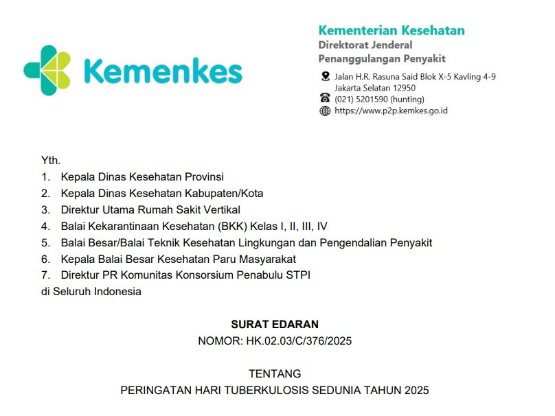Menjelang peringatan Hari Tuberkulosis Sedunia (HTBS) 2025, Kementerian Kesehatan (Kemenkes) RI mengajak seluruh masyarakat Indonesia untuk bersama-sama menguatkan komitmen dalam upaya eliminasi Tuberkulosis (TBC), dimana melalui kampanye GIATKAN: Gerakan Indonesia Akhiri Tuberkulosis dengan Komitmen dan Aksi Nyata, melalui Surat Edaran (SE) NOMOR: HK.02.03/C/376/2025 Tentang Peringatan Hari Tuberkulosis Sedunia Tahun 2025.