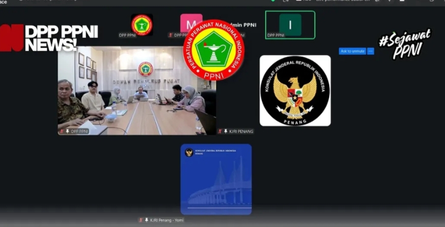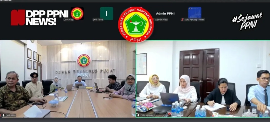 Berkaitan itu Ketua Umum DPP PPNI Harif Fadhillah didampingi Sekretaris III Ahmad Eru Saprudin beserta Tim Fasilitasi PPNI melaksanakan pertemuan virtual bersama Konsulat Jenderal Republik Indonesia (KJRI) Penang yang dihadiri Yomi Ayu Lestari dan jajarannya di Graha PPNI, Jakarta, Selasa (7/4/2026).
